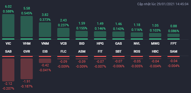 Đà hồi phục được duy trì tốt đến hết phiên giao dịch. Các mã như FPT, VHM, VNM và PNJ đều được kéo lên mức giá trần. MWG tăng 6,8% lên 132.700 đồng/cp. Mới đây, CTCP Đầu tư Thế Giới Di Động (MWG) đã công bố BCTC hợp nhất quý IV/2020 với lợi nhuận sau thuế đạt hơn 942 tỷ đồng, tăng 10% so với cùng kỳ năm trước. Lũy kế năm 2020, lợi nhuận sau thuế tăng 2% đạt mức kỷ lục 3.920 tỷ đồng.