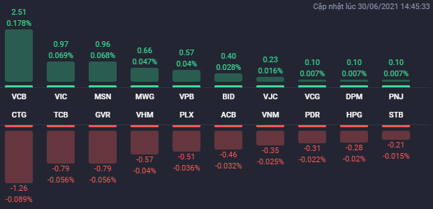 Thị trường chứng khoán Việt Nam có những biến động bất ngờ trong phiên chốt NAV của các quỹ. Phần lớn thời gian của phiên giao dịch ngày 30/6, thị trường biến động tích cực với sự bứt phá của nhiều cổ phiếu trụ cột như VIC, VHM, MSN, VCB… Điều này giúp chỉ số chính VN-Index giao dịch trên mốc tham chiếu ở phần lớn thời gian của phiên, bất chấp việc nhiều cổ phiếu lớn chìm trong sắc đỏ.