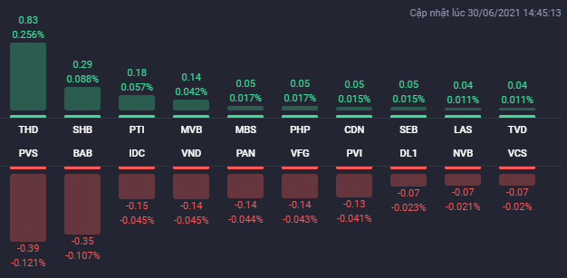 Kết thúc phiên giao dịch ngày 30/6, VN-Index giảm 1,49 điểm (-0,11%) xuống 1.408,55 điểm. Toàn sàn có 139 mã tăng, 233 mã giảm và 62 mã đứng giá. HNX-Index giảm 0,47 điểm (-0,15%) xuống 323,32 điểm. Toàn sàn có 86 mã tăng, 125 mã giảm và 74 mã đứng giá. UPCoM-Index giảm 0,05 điểm (-0,06%) xuống 90,25 điểm.