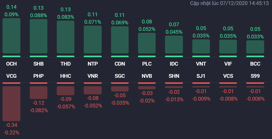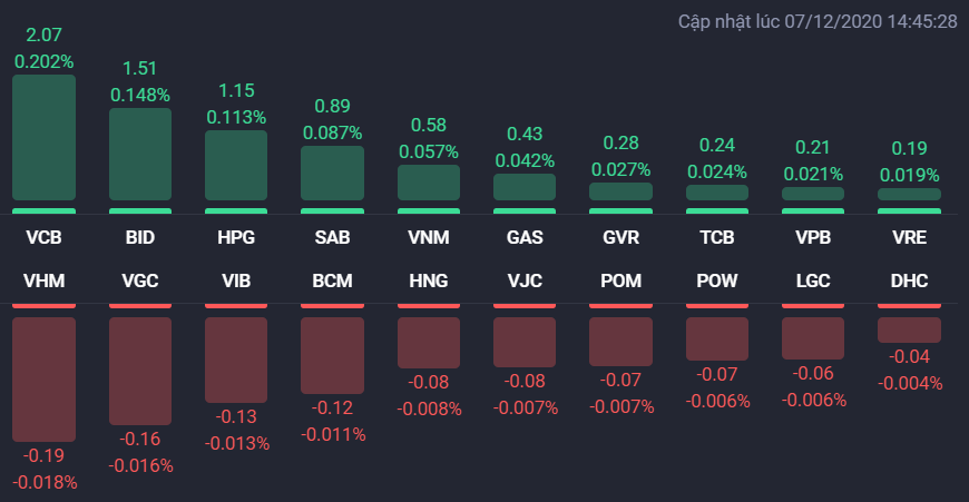 Quay trở lại với diễn biến thị trường chung, VCB, BID, HPG, SAB, VNM, GAS, GVR... tăng giá mạnh và góp công lớn trong việc kéo VN-Index lên sát mốc 1.030 điểm. VCB chốt phiên tăng 2,2% lên 93.100 đồng/cp, BID tăng 3,2% lên 43.000 đồng/cp, SAB tăng 2,5% lên 207.000 đồng/cp, GVR tăng 1,2% lên 20.300 đồng/cp. GVR thông báo đăng ký bán hơn 9,3 triệu cổ phiếu SIP, tương đương với 11,77% số cổ phiếu đang lưu hành. Thời gian giao dịch từ ngày 9/12 - 21/12/2020. Phương thức giao dịch là khớp lệnh hoặc thỏa thuận tại HNX.