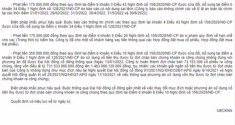 Phạt tiền 125 triệu đồng do không lưu giữ tài liệu về việc lựa chọn nhà đầu tư tham gia mua chứng khoán chào bán hoặc phát hành riêng lẻ (Các trái chủ mua trái phiếu APGH2124001 phát hành trong năm 2021 của Công ty là 29 nhà đầu tư cá nhân trong nước; tuy nhiên, Công ty không lưu giữ tài liệu về việc xác định nhà đầu tư chứng khoán chuyên nghiệp đối với các cá nhân này).