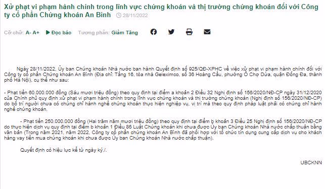 Trước đó, UBCKNN xử phạt vi phạm hành chính đối với CTCP Chứng khoán An Bình (ABS) gồm 60 triệu đồng do bố trí người chưa có chứng chỉ hành nghề chứng khoán thực hiện nghiệp vụ, vị trí mà theo quy định pháp luật phải có chứng chỉ hành nghề chứng khoán.