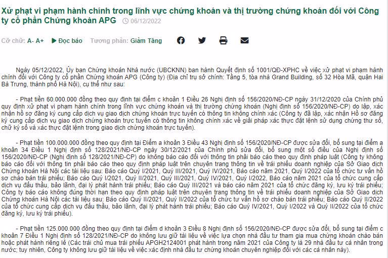 Đơn cử ngày 5/12, Ủy ban Chứng khoán Nhà nước (UBCKNN) ban hành Quyết định số 1001/QĐ-XPHC về việc xử phạt vi phạm hành chính đối với Công ty cổ phần Chứng khoán APG.