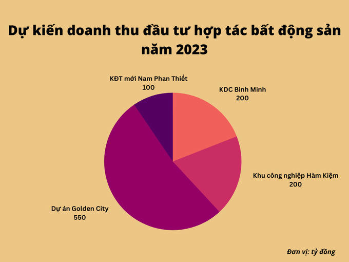 Không chỉ doanh thu từ bất động sản, Hoàng Quân kỳ vọng việc hợp tác đầu tư bất động sản với các đơn vị khác cũng mang về 1.050 tỷ đồng doanh thu cho công ty trong năm 2023. Cụ thể: