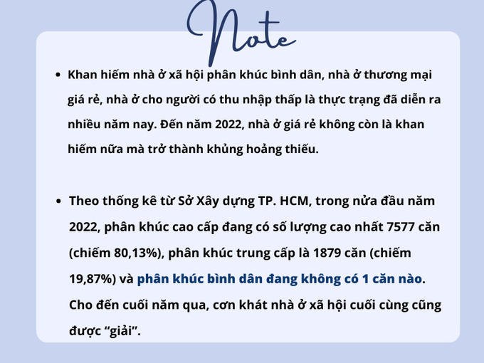 Để tháo gỡ “khủng hoảng thiếu”, Chính phủ đã phê duyệt Đề án "Đầu tư xây dựng ít nhất 1 triệu căn hộ nhà ở xã hội cho đối tượng thu nhập thấp, công nhân khu công nghiệp giai đoạn 2021 - 2030” ngay trong đầu năm 2023.
