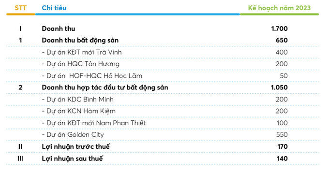 Về kế hoạch kinh doanh, HQC đặt mục tiêu doanh thu đạt 1.700 tỷ, gấp 5 lần mức khá èo uột của năm 2022. Trước nhiều thời cơ đang rộng mở, Hoàng Quân mạnh dạn đặt kế hoạch lợi nhuận sau thuế tăng mức không tưởng gần 645% lên 140 tỷ đồng.