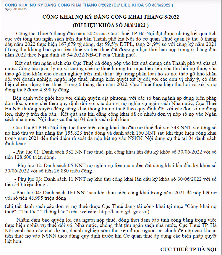 Tính tới kỳ khóa sổ 30/6, Cục Thuế TP. Hà Nội cho biết có 332 người nộp thuế nợ thuế, phí công khai lần đầu với số tiền gần 128,6 tỷ đồng. Đáng chú ý, trong danh sách có nhiều doanh nghiệp kinh doanh bất động sản, xây dựng nợ thuế “khủng”.