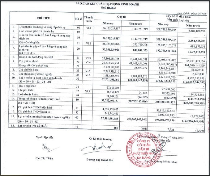 Lũy kế trong 9 tháng năm 2023, công ty ghi nhận doanh thu đạt 368,75 tỷ đồng, gấp 153,9 lần so với cùng kỳ và lợi nhuận sau thuế đạt 195 tỉ đồng, cùng kỳ năm trước lỗ 123,99 tỉ đồng.