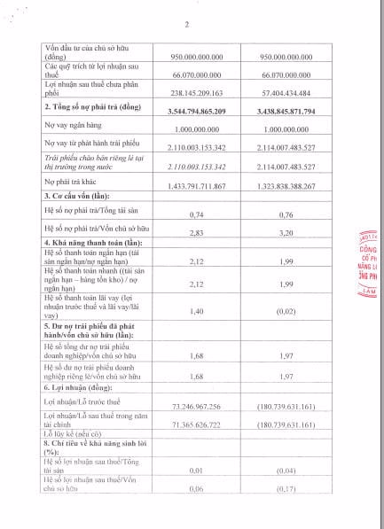 Hệ quả là vốn chủ sở hữu của doanh nghiệp giảm mạnh xuống còn 1.073 tỷ đồng. Trong khi đó, tổng nợ phải trả tăng lên gần 3.439 tỷ đồng, đẩy hệ số nợ/vốn chủ sở hữu từ 2,83 lên 3,2 lần. Đáng chú ý, dư nợ trái phiếu chiếm hơn 2.100 tỷ đồng, tạo áp lực lớn về chi phí lãi vay và nghĩa vụ tài chính dài hạn.
