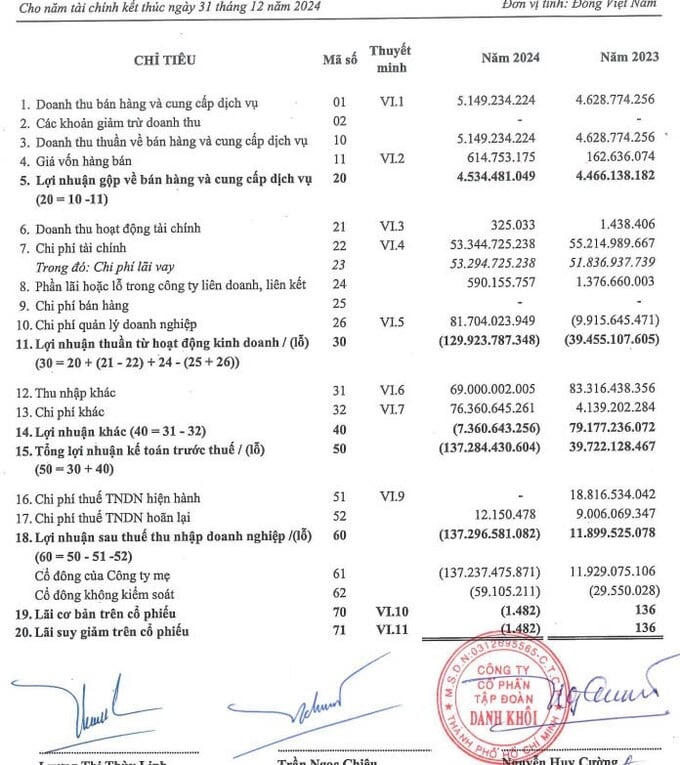 Tiếp đến là Công ty CP Tập đoàn Danh Khôi (NRC) cũng ghi nhận khoản lỗ ròng lên đến hơn 137 tỷ đồng, gấp đôi so với mức lỗ hơn 63 tỷ đồng trong báo cáo tự lập trước đó. Cụ thể, trong báo cáo tài chính kiểm toán, chi phí quản lý đã tăng 40%, lên gần 82 tỷ đồng do khoản chi phí dự phòng từ gần 36 tỷ đồng tăng lên hơn 56 tỷ đồng. Công ty cũng không còn ghi nhận khoản lãi khác 47 tỷ đồng mà thay vào đó là khoản lỗ hơn 7 tỷ đồng.