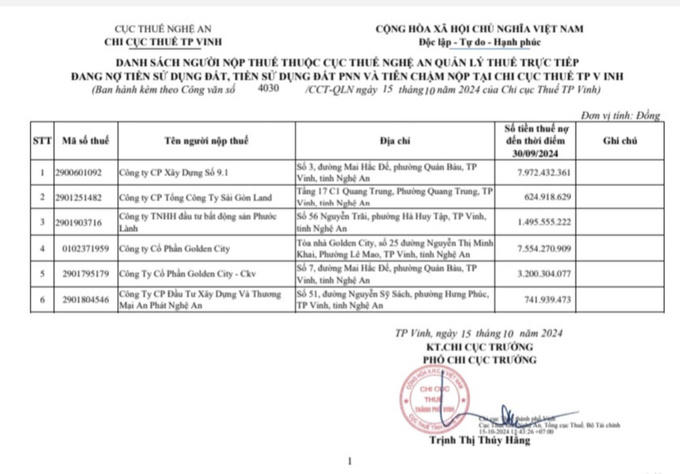 Bên cạnh đó còn có các doanh nghiệp khác như: Công ty CP Tổng Công Ty Sài Gòn Land Tầng 17 C1 Quang Trung, phường Quang Trung nợ hơn 624 triệu đồng; Công ty TNHH đầu tư bất động sản Phước Lành, số 56 Nguyễn Trãi, phường Hà Huy Tập, TP Vinh: 1,4 tỷ đồng; Công ty Cổ Phần Golden City Tòa nhà Golden City, số 25 đường Nguyễn Thị Minh Khai: 7,5 tỷ đồng; Công ty Cổ Phần Golden City - CKV Số 7, đường Mai Hắc Đế, phường Quán Bàu: 3,2 tỷ đồng và Công ty CP Đầu tư xây dựng và Thương mại An Phát Nghệ An, số 51, đường Nguyễn Sỹ Sách, phường Hưng Phúc đang nợ hơn 741 triệu đồng.