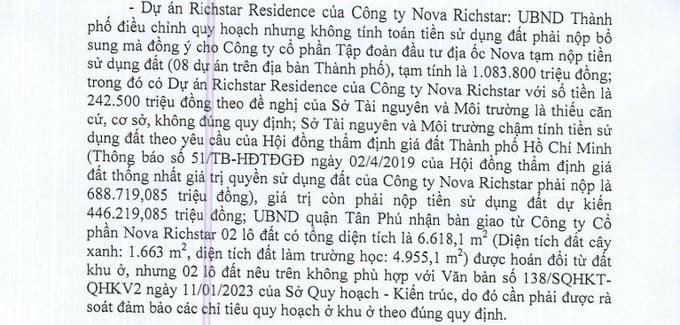 Trong đó có dự án Richstar Residence của Công ty Nova Richstar với số tiền là 242,5 tỷ đồng theo đề nghị của Sở Tài nguyên và Môi trường (TN-MT) là thiếu căn cứ, cơ sở, không đúng quy định; Sở TN-MT chậm tính tiền sử dụng đất theo yêu cầu của Hội đồng thẩm định giá đất Tp.HCM (Thông báo số 51/TB-HĐTĐGĐ ngày 2/4/2019 của Hội đồng thẩm định giá đất thống nhất giá trị quyền sử dụng đất của Công ty Nova Richstar phải nộp là gần 689 tỷ đồng, giá trị còn phải nộp tiền sử dụng đất dự kiến hơn 446 tỷ đồng.