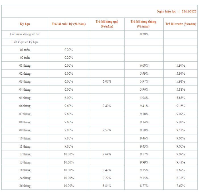 Tại kỳ hạn 12 tháng, ngân hàng áp dụng mức lãi suất cao nhất là 9,95%/năm. Đây cũng là mức lãi suất cao nhất ngân hàng hiện đang áp dụng.