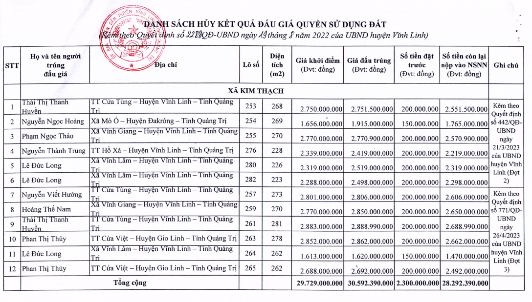 UBND huyện Vĩnh Linh mới đây đã ra quyết định hủy kết quả trúng đấu giá quyền sử dụng đất đối với 12 lô đất tại khu dân cư Mũi Lò Vôi, xã Kim Thạch. Nguyên nhân là do người trúng đấu giá từ chối và không thực hiện nghĩa vụ tài chính theo quy định.