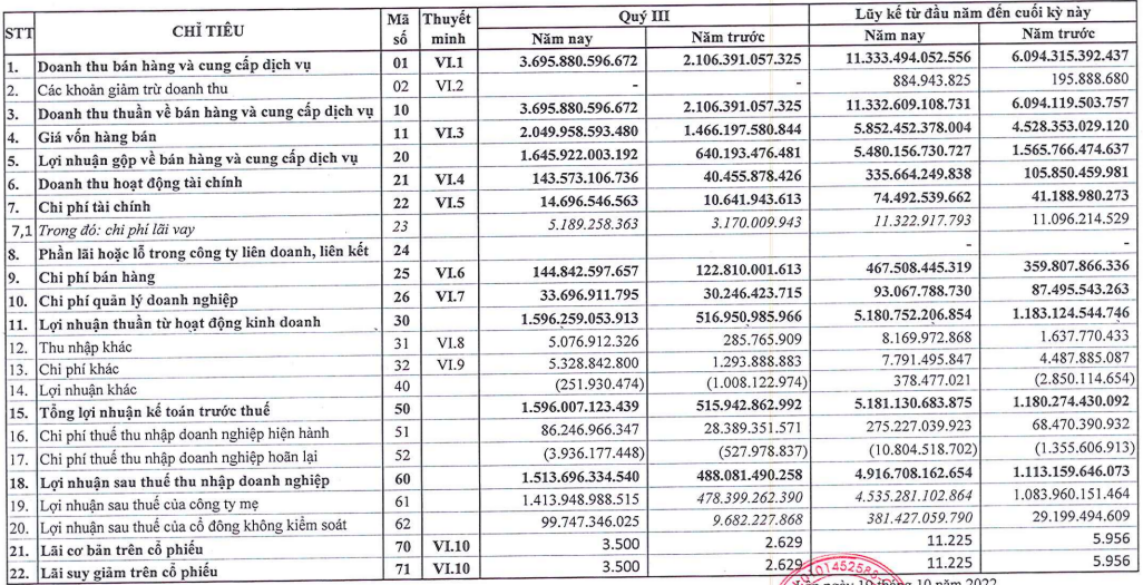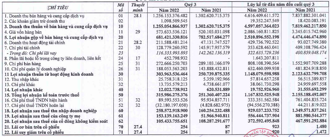 Lũy kế 9 tháng, doanh thu toàn tập đoàn khoảng hơn 45.000 tỷ đồng, tương đương 86,5% kế hoạch năm. Lợi nhuận hợp nhất ước đạt 5.400 tỷ đồng, gần gấp 3 lần kế hoạch năm 2022. Nộp ngân sách nhà nước ước đạt 1.535 tỷ đồng, bằng 93% kế hoạch năm.