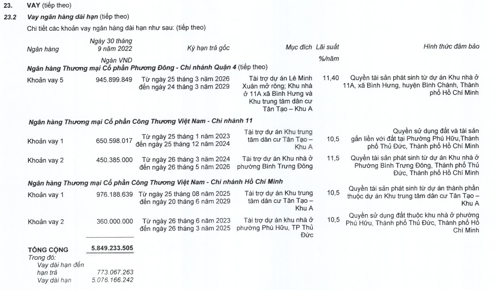 Việc gia tăng mạnh tồn kho là nguyên nhân chính khiến dòng tiền thuần từ hoạt động kinh doanh của Nhà Khang Điền trong 9 tháng đầu năm âm đến 2.315 tỷ đồng, trong khi cùng kỳ âm 845 tỷ đồng. Để bù đắp thâm hụt dòng tiền kinh doanh chính, Nhà Khang Điền tiếp tục tăng vay nợ. Tại thời điểm cuối quý III/2022, tổng nợ phải trả của doanh ghiệp tăng 2,3 lần lên 9.786 tỷ đồng. Dư nợ vay ở mức 7.206 tỷ đồng (gấp 2,8 lần đầu năm), trong đó, nợ tài chính dài hạn ghi nhận 6.176 tỷ đồng (gấp 3,6 lần so với đầu năm).