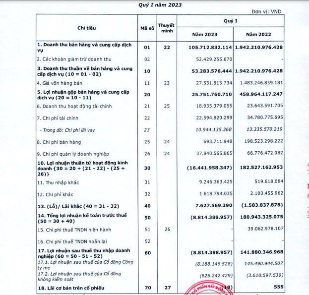 Kết quả, Danh Khôi báo lỗ gần 17 tỷ đồng trong quý I/2023. Trước đó trong quý IV/2022, Danh Khôi cũng chỉ kiếm được 1 tỷ đồng doanh thu và báo lỗ 60 tỷ đồng.