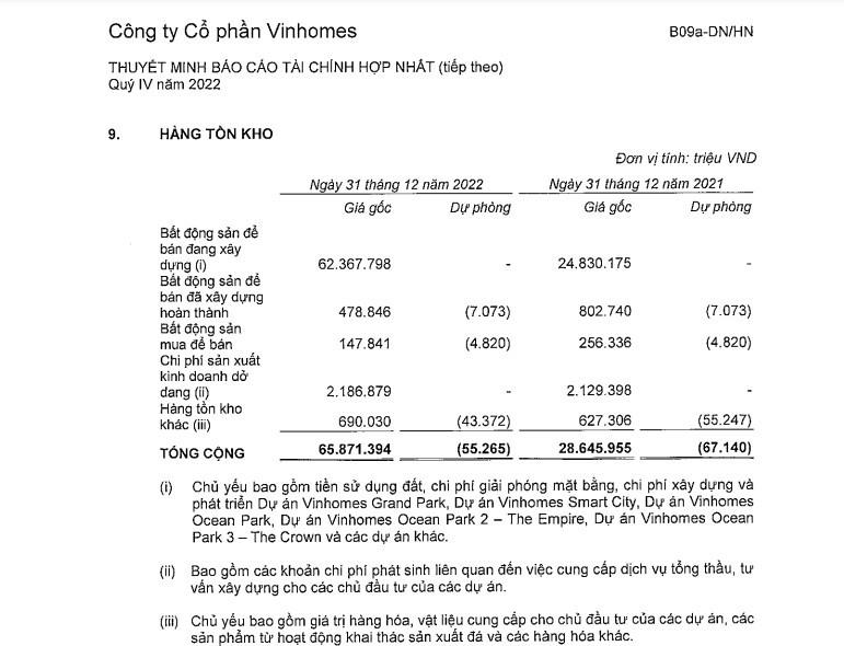 Cụ thể, hàng tồn kho của Vinhomes tại ngày 31/12/2022 ở mức 65.816 tỷ đồng, chủ yếu nằm ở bất động sản để bán đang xây dựng (chủ yếu bao gồm tiền sử dụng đất, chi phí giải phóng mặt bằng, chi phí xây dựng và phát triển) ở dự án Vinhomes Grand Park, dự án Vinhomes Smart City, dự án Vinhomes Ocean Park, dự án Vinhomes Ocean Park 2 - The Empire, dự án Vinhomes Ocean Park 3 - The Crown và các dự án khác.