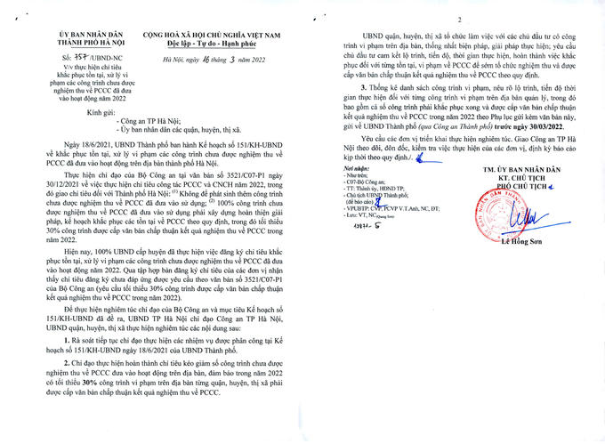 Theo đó, UBND TP Hà Nội đã ban hành kế hoạch về khắc phục tồn tại, xử lý vi phạm các công trình chưa được nghiệm thu về PCCC đã đưa vào hoạt động trên địa bàn TP. Đồng thời, thực hiện chỉ đạo của Bộ Công an tại văn bản số 3521/C07-P1 ngày 30/12/2021 về việc thực hiện chỉ tiêu công tác PCCC và cứu nạn cứu hộ năm 2022, trong đó giao chỉ tiêu đối với TP Hà Nội: Không để phát sinh thêm công trình chưa được nghiệm thu về PCCC đã đưa vào sử dụng; 100% công trình chưa được nghiệm thu về PCCC đã đưa vào sử dụng phải xây dựng hoàn thiện giải pháp, kế hoạch khắc phục các tồn tại về PCCC theo quy định, trong đó tối thiểu 30% công trình được cấp văn bản chấp thuận kết quả nghiệm thu về PCCC trong năm 2022.