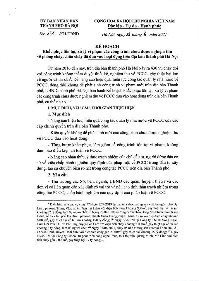 Trước đó ngày 18/06/2021, UBND TP Hà Nội đã có kế hoạch 151/KH về việc khắc phục tồn tại, xử lý vi phạm các công trình chưa được nghiệm thu về phòng cháy, chữa cháy đã đưa vào hoạt động trên địa bàn Thành phố Hà Nội.