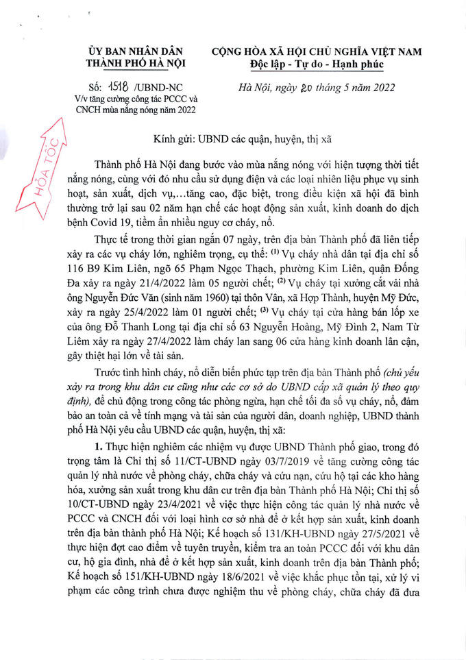 Tại công văn số 1518/UBND-NC của UBND TP Hà Nội ngày 20/05/2022 tăng cường công tác PCCC và CNCH mùa nắng nóng năm 2022 gửi các quận, huyện, thị xã cho biết: Thành phố Hà Nội đang bước vào mùa nắng nóng với hiện tượng thời tiết nắng nóng, cùng với đó nhu cầu sử dụng điện và các loại nhiên liệu phục vụ sinh hoạt, sản xuất, dịch vụ,...tăng cao, đặc biệt, trong điều kiện xã hội đã bình thường trở lại sau 02 năm hạn chế các hoạt động sản xuất, kinh doanh do dịch bệnh Covid 19, tiềm ẩn nhiều nguy cơ cháy, nổ.