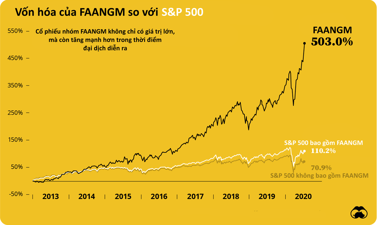 Ngoài những tác động tiêu cực, dịch Covid-19 còn mang đến những cơ hội lớn cho một số ngành, hưởng lợi nhiều nhất là công nghệ. Vốn hóa của các cổ phiếu công nghệ lớn trong S&P 500 đã tăng vọt. Trong 7 năm trước tháng 7/2020, vốn hóa của 6 cổ phiếu – Facebook, Apple, Amazon, Netflix, Alphabet và Microsoft, tăng hơn 500%. Trong khi đó, S&P 500 chỉ tăng 110%.
