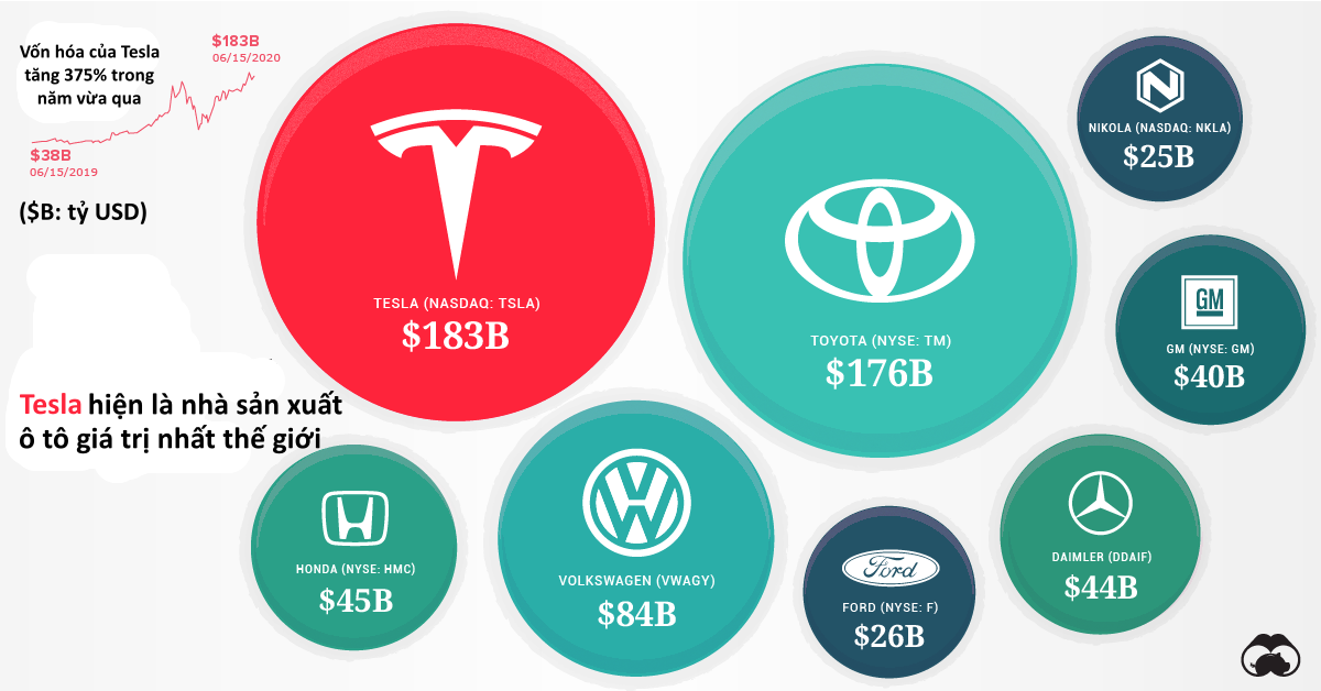 Kể từ tháng 6/2019, vốn hóa của Tesla tăng hơn 375% và cao hơn cả 9 nhà sản xuất ô to lớn nhất thế giới cộng lại. Ngoài ra, cổ phiếu Tesla cũng chính thức được đưa vào S&P 500, trở thành cổ phiếu có giá trị lớn thứ 8 trong chỉ số này.