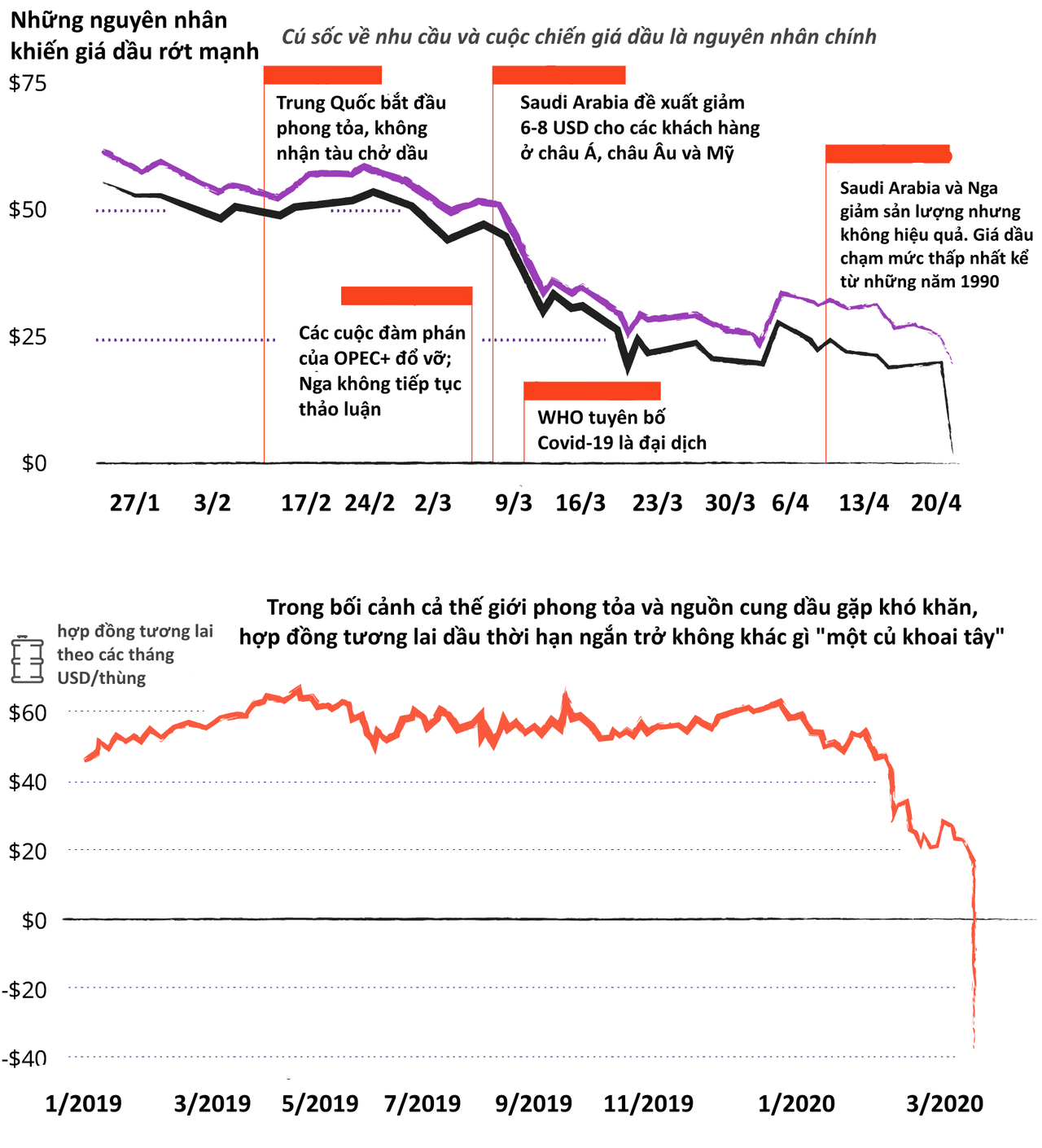 Một sự kiện lịch sử khác cũng diễn ra trong năm 2020, đó là giá dầu lần đầu tiên rơi xuống mức âm. Hợp đồng tương lai của dầu WTI giảm xuống mức -37,63 USD trong này 20/4, khi các nhà sản xuất phải trả tiền cho người giao dịch để mua hợp đồng dầu. Tuy nhiên, cho đến hiện tại, giá dầu đã hồi phục sau cú sốc, quay trở lại mức giá bình thường.