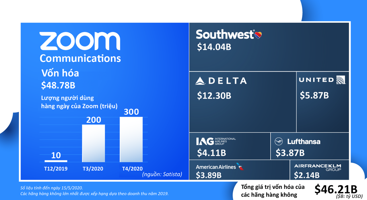 Nhờ số lượng người sử dụng theo từng tháng tăng không ngừng, vốn hóa của Zoom đã thăng hoa và thậm chí còn đạt mức cao hơn vốn hóa của 7 hãng hàng không lớn nhất nước Mỹ cộng lại.