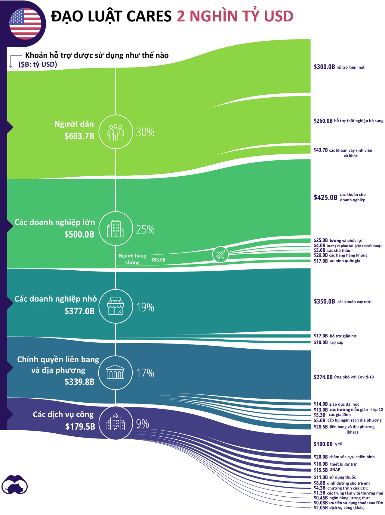 Ngày 27/3, đạo luật CARES chính thức được chính phủ Mỹ thông qua sau một thời gian gặp trở ngại trong các cuộc thảo luận. Gói giải cứu lịch sử này bao gồm 1.200 USD hỗ trợ trực tiếp cho người dân, hơn 350 tỷ USD cho các doanh nghiệp nhỏ và hơn 100 tỷ USD cho hệ thống y tế Mỹ.