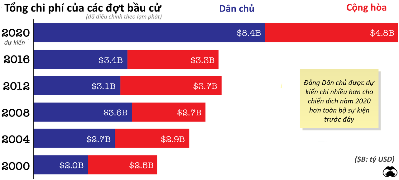 Năm 2020, khoản chi tiêu cho sự kiện bầu cử Tổng thống Mỹ đã vượt mức 13 tỷ USD, cao hơn gấp đôi so với năm 2016. Tổng cộng, chi tiêu của quốc hội đã chạm mức 7 tỷ USD, trong đó mức chi của đảng Dân chủ cao hơn 64% so với đảng Cộng hòa cho các cuộc đua vào Thượng viện và Hạ viện.