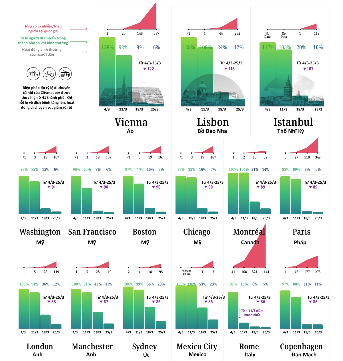 Từ giấy vệ sinh cho đến lệnh hạn chế tụ tập đông người, tác động của dịch Covid-19 đến cuộc sống xung quanh trở nên rõ ràng hơn kể từ đầu tháng 3. Khi cuộc sống hàng ngày bị đình trệ, hoạt động di chuyển tại tác thành phố lớn trên thế giới sụt giảm nghiêm trọng trong tháng 3.