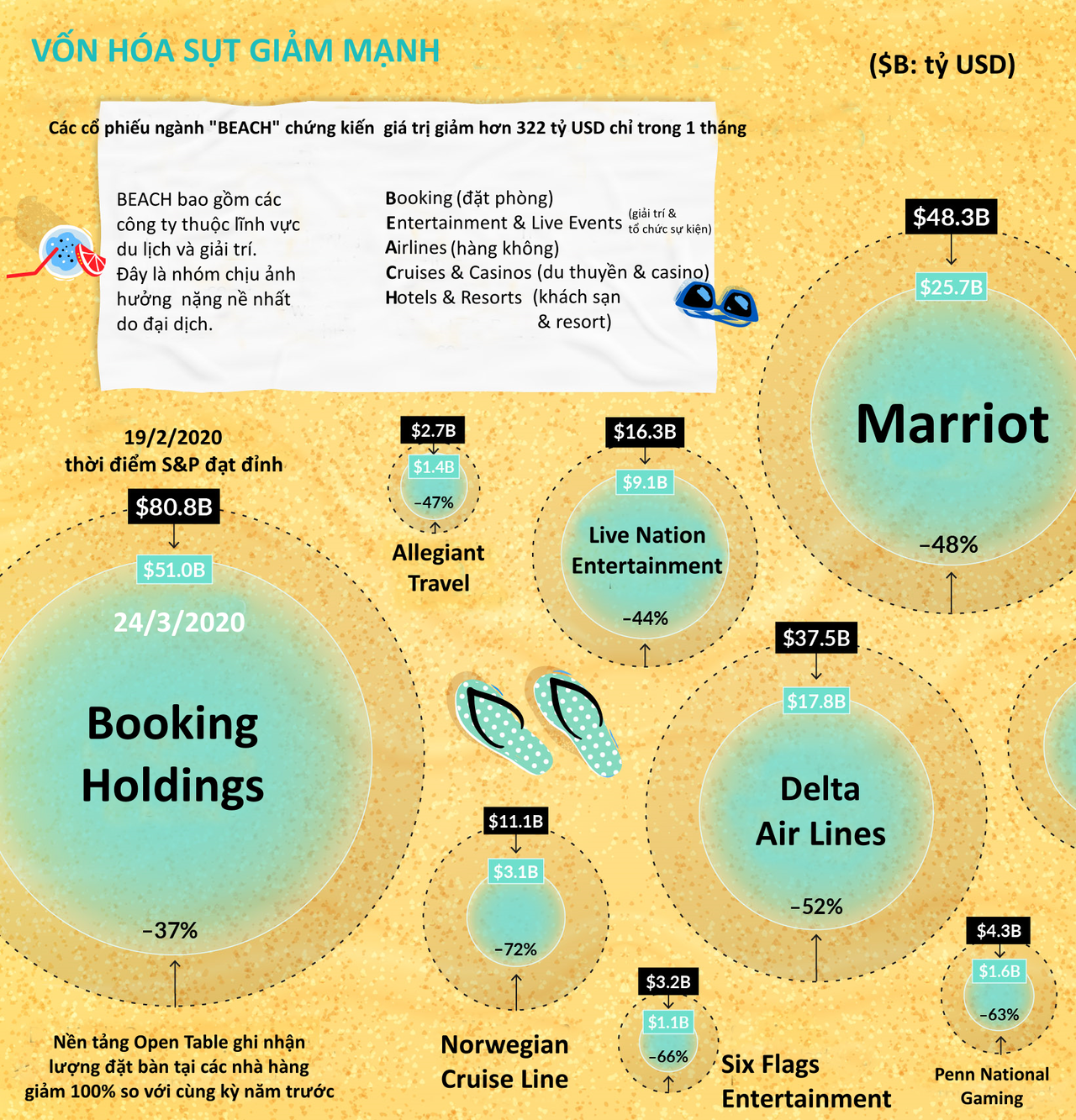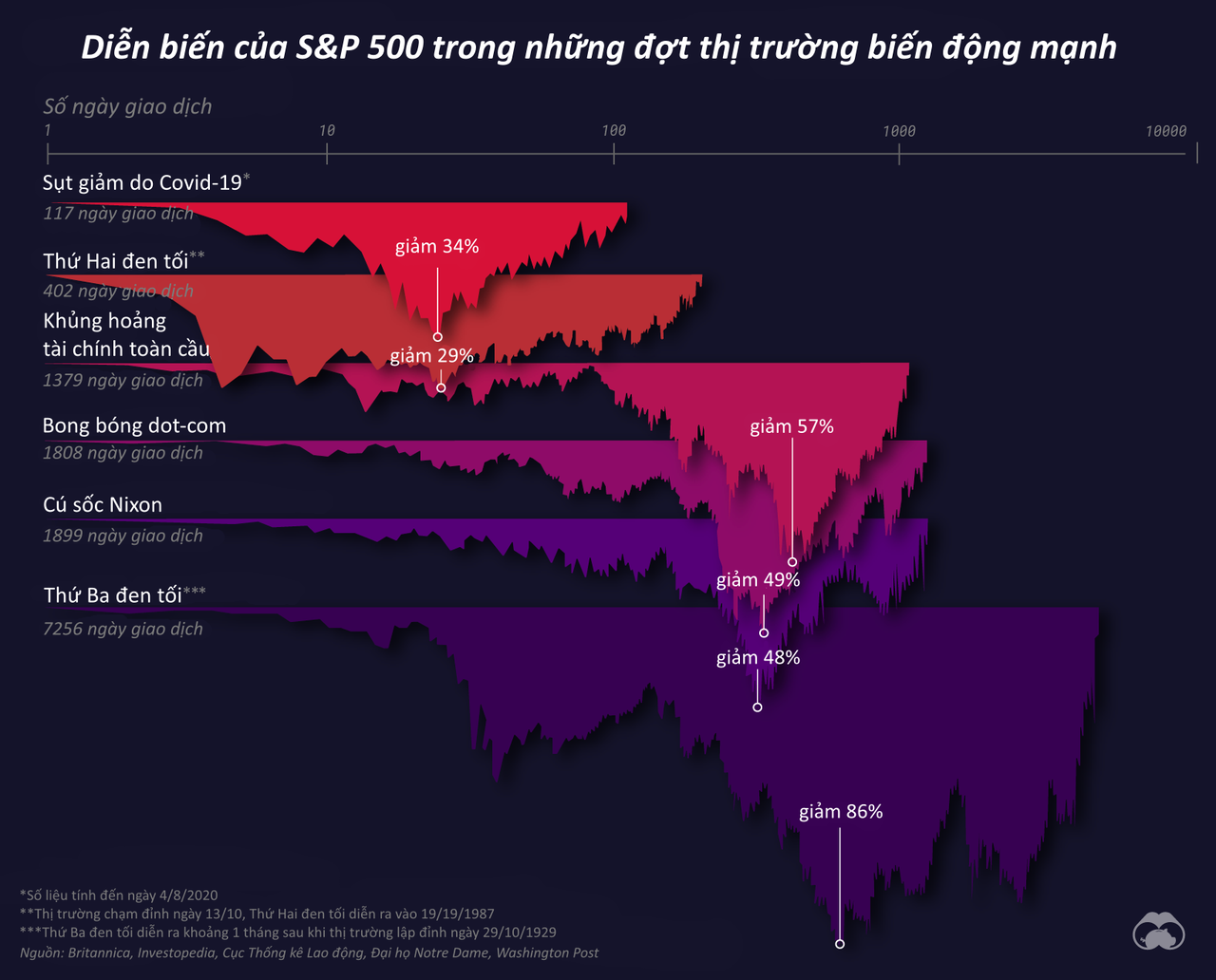 Do tác động khủng khiếp của dịch bệnh lên nền kinh tế, chỉ số S&P 500 đã chứng kiến hơn 1/3 giá trị bị “quét sạch” chỉ trong vòng chưa đầy 1 tháng. S&P 500 ghi nhận mức giảm 30% xảy ra với tốc độ nhanh chưa từng thấy. Theo đó, ngành du lịch toàn cầu hứng chịu những tổn thất nặng nề, khi vô số du thuyền phải ngừng hoạt động và số lượng chuyến bay thương mại chỉ hoạt động chưa đến 1 nửa công suất.