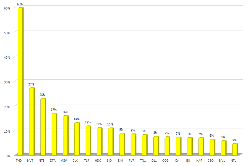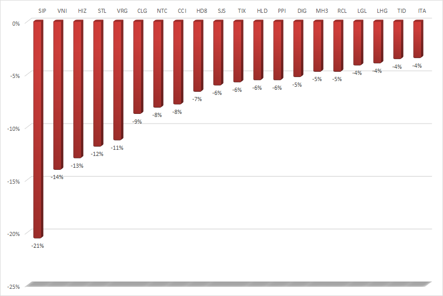 Ở chiều ngược lại, cổ phiếu SIP của CTCP Đầu tư Sài Gòn VRG giảm mạnh nhất với 20,6%. Như vậy, cổ phiếu SIP đã điều chỉnh trở lại sau khi tăng rất mạnh ở tuần trước đó. Mới đây, Tập đoàn Công nghiệp Cao su Việt Nam (GVR) thông báo đăng ký bán hơn 9,3 triệu cổ phiếu SIP tương đương với 11,77% số cổ phiếu đang lưu hành. Thời gian giao dịch từ ngày 9/12 đến 21/12. Phương thức giao dịch là khớp lệnh hoặc thỏa thuận tại HNX. Theo phương án thoái vốn đã được phê duyệt, giá khởi điểm thoái vốn lần này là 97.500 đồng/cp. Tuy nhiên, nếu giá khởi điểm này thấp hơn giá tham chiếu bình quân 30 ngày liên tiếp trên thị trường chứng khoán thì sẽ lấy theo giá tham chiếu bình quân này.