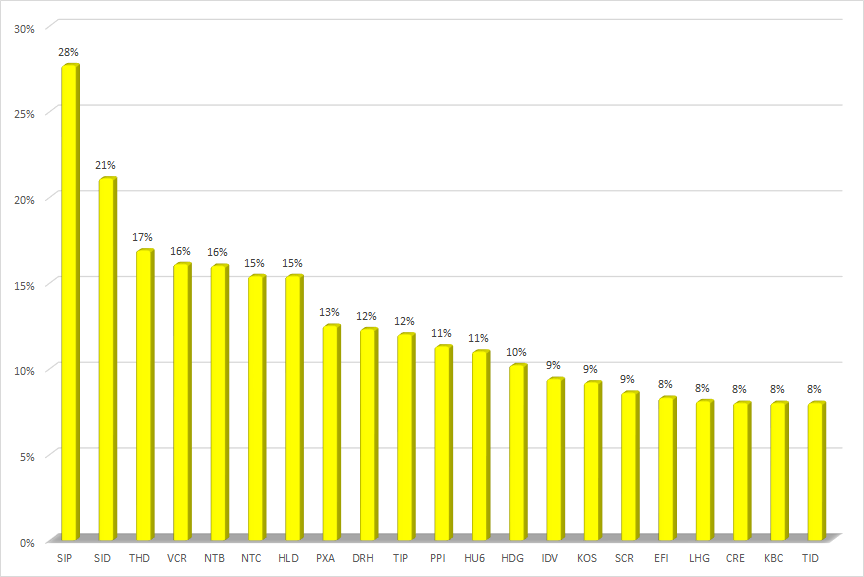 Cổ phiếu tăng giá mạnh nhất là SIP của CTCP Đầu tư Sài Gòn VRG với gần 28%. SIP đang có chuỗi 15 phiên tăng điểm liên tiếp và thị giá cũng tăng đến 69% trong thời gian này.
