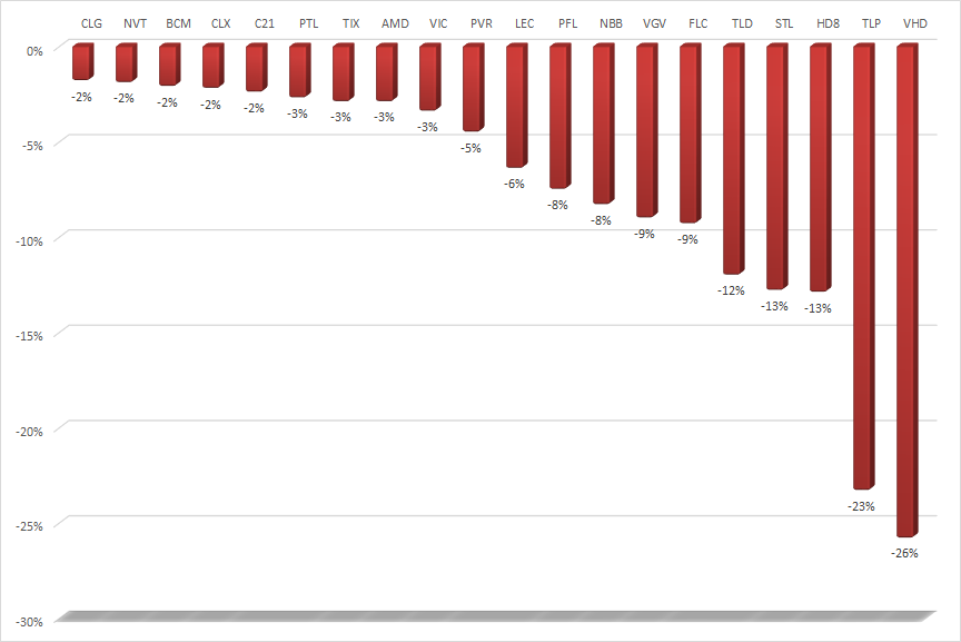 Ở chiều giảm, nhóm bất động sản tuần qua chỉ có 5 mã giảm giá trên 10% là VHD của CTCP Đầu tư phát triển Nhà và Đô thị Vinaconex, TLP của Tổng công ty Thương mại Xuất nhập khẩu Thanh Lễ - CTCP, HD8 của CTCP Đầu tư Phát triển Nhà và Đô thị HUD8, STL của CTCP Sông Đà - Thăng Long và TLD của CTCP Đầu tư Xây dựng và Phát triển Đô thị Thăng Long. Trong đó, VHD và TLP nắm giữ 2 vị trí giảm mạnh nhất với lần lượt 26% và 23%.