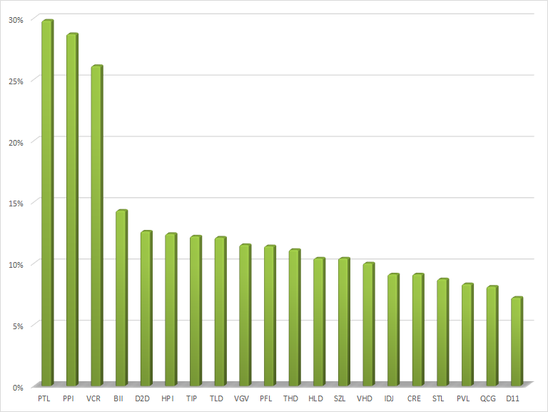 Ở chiều tăng giá, cổ phiếu PTL của Petroland tăng giá mạnh nhất với 29,8% từ 4.900 đồng/cp lên 6.360 đồng/cp. Trong tuần, PTL đã có 4 phiên tăng trần liên tiếp và một phiên giảm giá. Thanh khoản của cổ phiếu này trong 3 phiên cuối tuần cũng tăng đột biến so với trước đó với khối lượng khớp lệnh mỗi phiên đều trên 100.000 đơn vị.