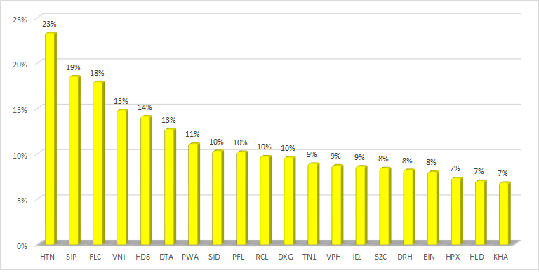 Cổ phiếu tăng giá mạnh nhất nhóm ngành này là HTN của CTCP Hưng Thịnh Incons với mức tăng 23,3% chỉ sau 1 tuần giao dịch. Động lực tăng giá của HTN đến từ việc doanh nghiệp này công bố 16/11 sẽ là ngày đăng ký cuối cùng nhận cổ tức năm 2019 bằng tiền tỷ lệ 18% (1 cổ phiếu nhận 1.800 đồng). Thời gian thanh toán 30/11/2020.
