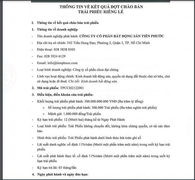 Trong đó, phát hành vào tháng 5 gần đây, Tiến Phước đã huy động 300 tỷ đồng với lãi suất cố định 11% mỗi năm. Tài sản đảm bảo là 60 triệu cổ phiếu của Tiến Phước và do Công ty Cổ phần Tập đoàn Tiến Phước bảo lãnh thanh toán.