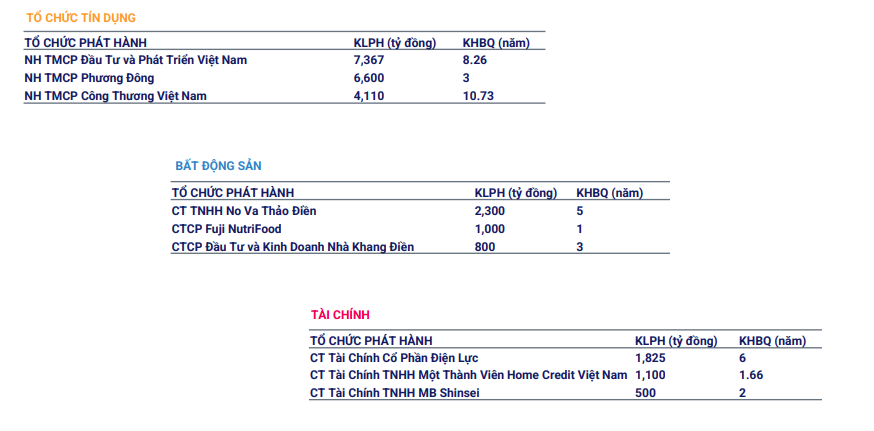 Nhóm Ngân hàng hiện vẫn dẫn đầu về giá trị phát hành với tổng giá trị đạt 136,287 tỷ đồng, tương đương 54% tổng giá trị phát hành. Nhóm Bất động sản đứng ở vị trí thứ hai với 51,699 tỷ đồng, chiếm khoảng 20%.