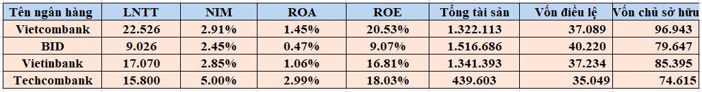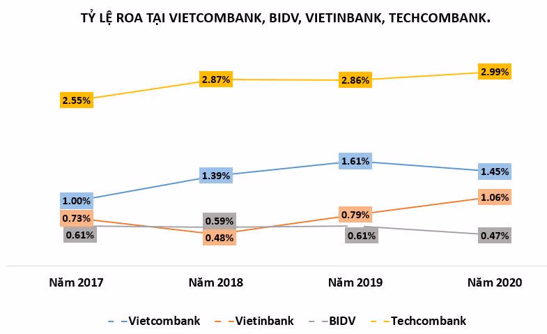 Như vậy, tỷ số ROA tại Techcombank vượt xa BIDV, Vietinbank và Vietcombank. Còn tỷ số ROE tại Techcombank chỉ cao hơn BIDV và Vietinbank và kém Vietcombank.