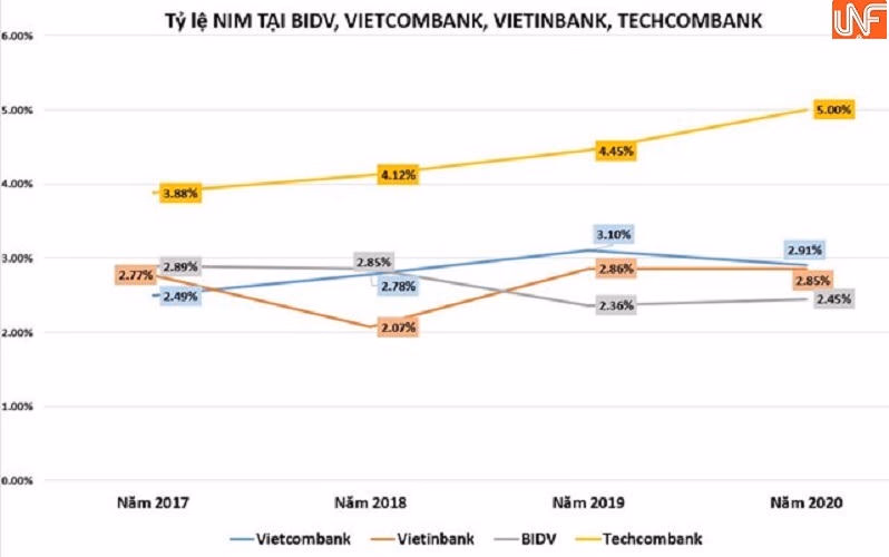 Bất ngờ, năm 2020, cả Vietcombank, BIDV, Vietinbank đều có NIM dưới 3%: BIDV (2,45%); Vietcombank (2,91%) và Vietinbank (2,85%). Trong khi tỷ lệ NIM của Techcombank đạt 5%. Có thể thấy, Techcombank đang sở hữu nhiều cái nhất trong nhóm ngân hàng.