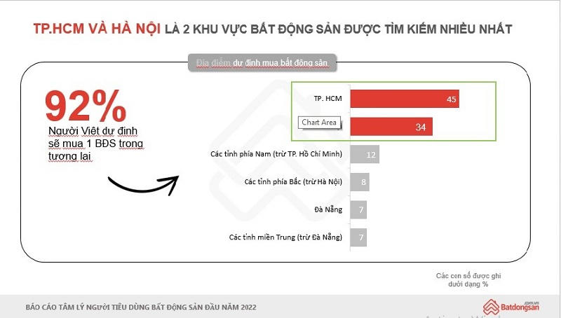 Người dân đang sống tại Hà Nội có dự định mua bất động sản trên địa bàn Hà Nội chiếm 83%, xu hướng tìm mua tại TP Hồ Chí Minh chiếm 4%, Đà Nẵng 3%, các tỉnh miền Bắc 8%, các tỉnh miền Trung 2%. Chỉ có 3% người dân tại TP Hồ Chí Minh tìm mua bất động sản tại Hà Nội, đại đa số tìm mua bất động sản tại chính nơi họ đang sống là TP Hồ Chí Minh với tỉ lệ 81%, 12% dự định mua bất động sản tại các tỉnh phía Nam và chỉ có 1% dự định mua bất động sản tại Đà Nẵng. Tương tự, 83% người dân Đà Nẵng có xu hướng tìm mua bất động sản tại chính quê hương, 7% có xu hướng tìm mua tại các tỉnh miền Trung, 5% có xu hướng tìm mua tại TP Hồ Chí Minh. Các khu vực còn lại như Hà Nội, các tỉnh miền Nam, các tỉnh miền Bắc chỉ dao động khoảng 2%.