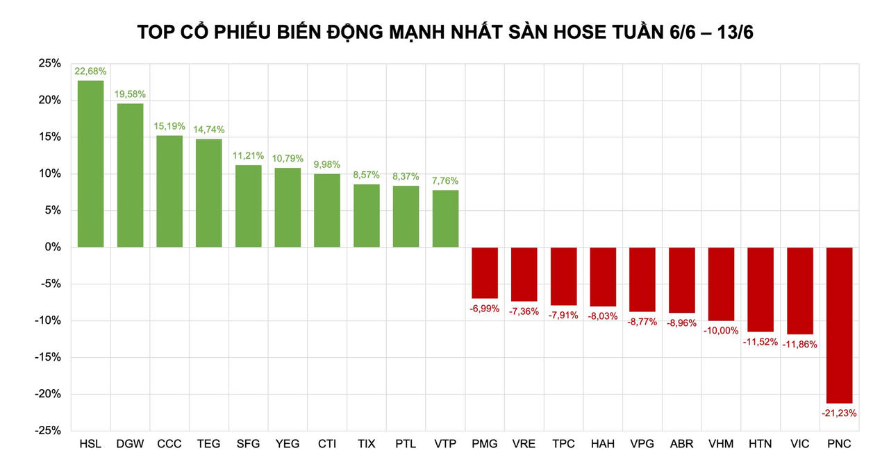 Trên sàn HoSE, 10 cổ phiếu tăng mạnh nhất tuần gồm: HSL (+22,68%), DGW (+19,58%), CCC (+15,19%), TEG (+14,74%), SFG (+11,21%), YEG (+10,79%), CTI (+9,98%), TIX (+8,57%), PTL (+7,92%) và VTP (+7,76%).