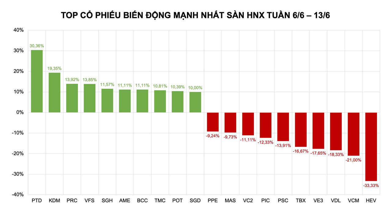 Trên sàn HNX, "quán quân" tăng trưởng gọi tên cổ phiếu PTD của Công ty CP Thiết kế Xây dựng Thương mại Phúc Thịnh. Tuần qua, mã này có thêm 30,36%. Tuy nhiên, thanh khoản lại có phần yếu ớt, cho thấy đà tăng chủ yếu mang tính kỹ thuật, thiếu dòng tiền lớn hỗ trợ. Hiện tại, vốn hóa của doanh nghiệp chỉ đạt 36 tỷ đồng.