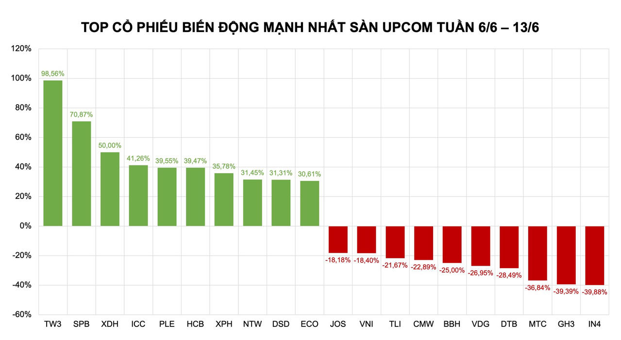 Sàn UpCOM tuần qua chứng kiến đà tăng bứt phá của nhiều cổ phiếu nhỏ. Danh sách 10 cổ phiếu tăng mạnh nhất lần lượt gọi tên: TW3 (+98,56%), SPB (+70,87%), XDH (+50,00%), ICC (+41,26%), PLE (+39,55%), HCB (+39,47%), XPH (+35,78%), NTW (+31,45%), DSD (+31,31%) và ECO (+30,61%).