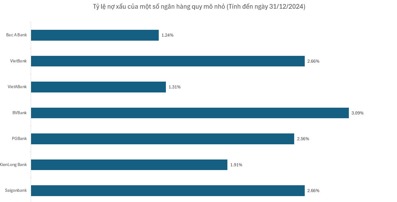 Tính đến ngày 31/12/2024, toàn ngành ngân hàng có 7 ngân hàng có vốn điều lệ dưới 10.000 tỷ đồng, bao gồm Saigonbank (3.387 tỷ đồng), KienLong Bank (3.652 tỷ đồng), PGBank (4.200 tỷ đồng), BVBank (5.118 tỷ đồng), VietBank (7.139 tỷ đồng), PVcomBank (9.000 tỷ đồng) và VietA Bank (5.399 tỷ đồng), Bac A Bank (8.959 tỷ đồng). Ngoài ra, còn có một số ngân hàng có vốn điều lệ “nhỉnh” hơn là ABBank (10.350 tỷ đồng) hay NCB (11.800 tỷ đồng).