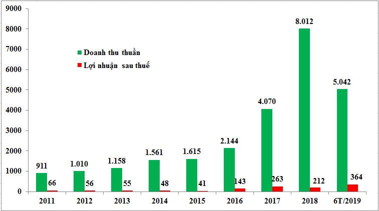 Dù doanh thu ghi nhận tăng trưởng mạnh 8 năm qua song lợi nhuận của doanh nghiệp rất trồi sụt, thậm chí có giai đoạn giảm tốc do sự đánh đổi của việc chiếm lĩnh thị phần.