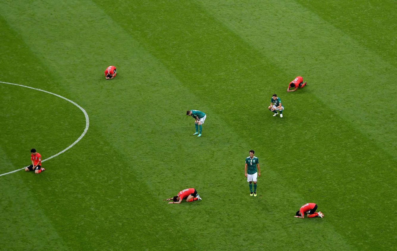 Phản ứng của các cầu thủ Đức và Hàn Quốc sau trận đấu ngày 27/6. Tuy thắng Đức, đội bóng châu Á vẫn không được đi tiếp. (Nguồn: Getty Images)