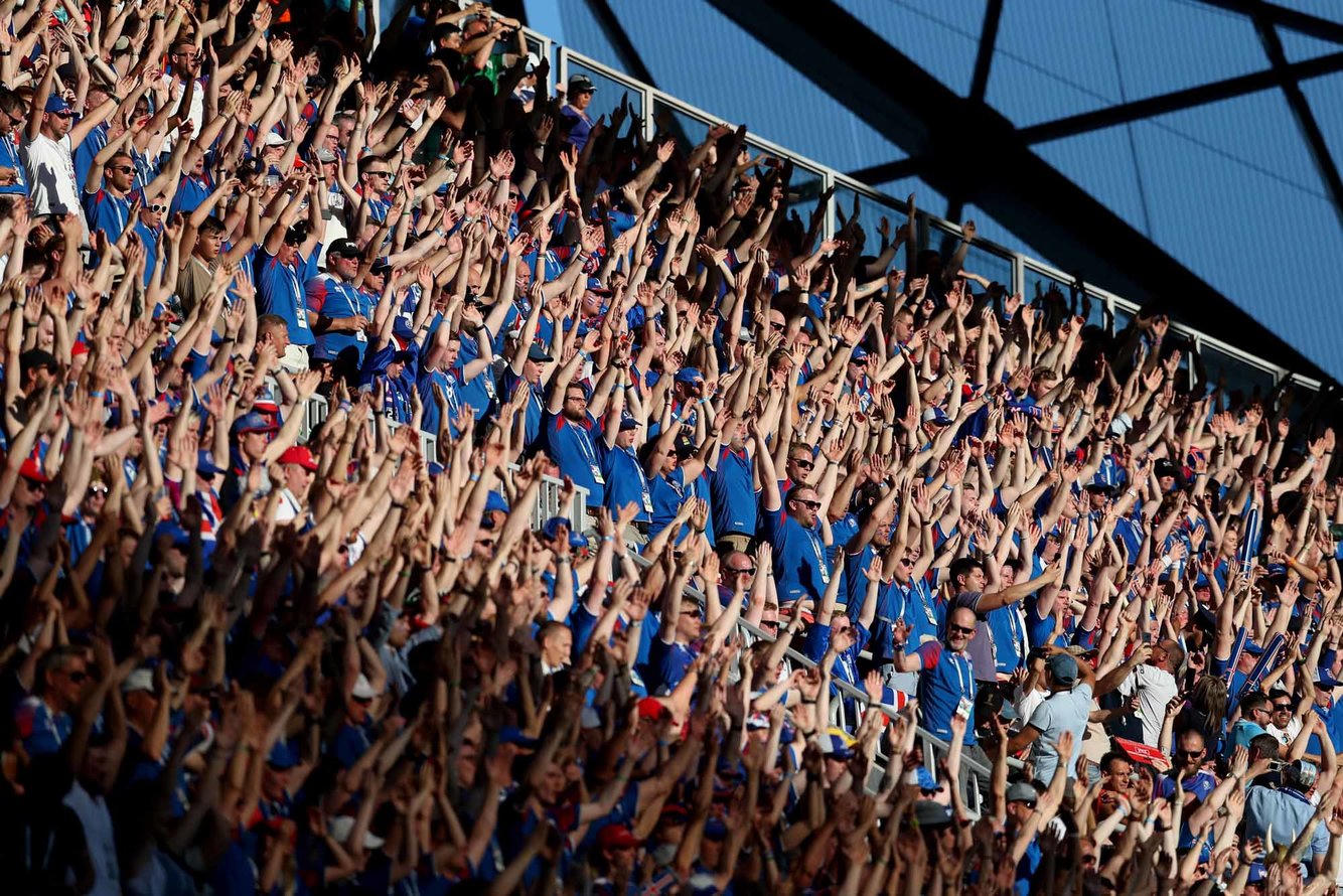 Cổ động viên Iceland hát vang bài hát truyền thống trên khán đài. (Nguồn: Getty Images)